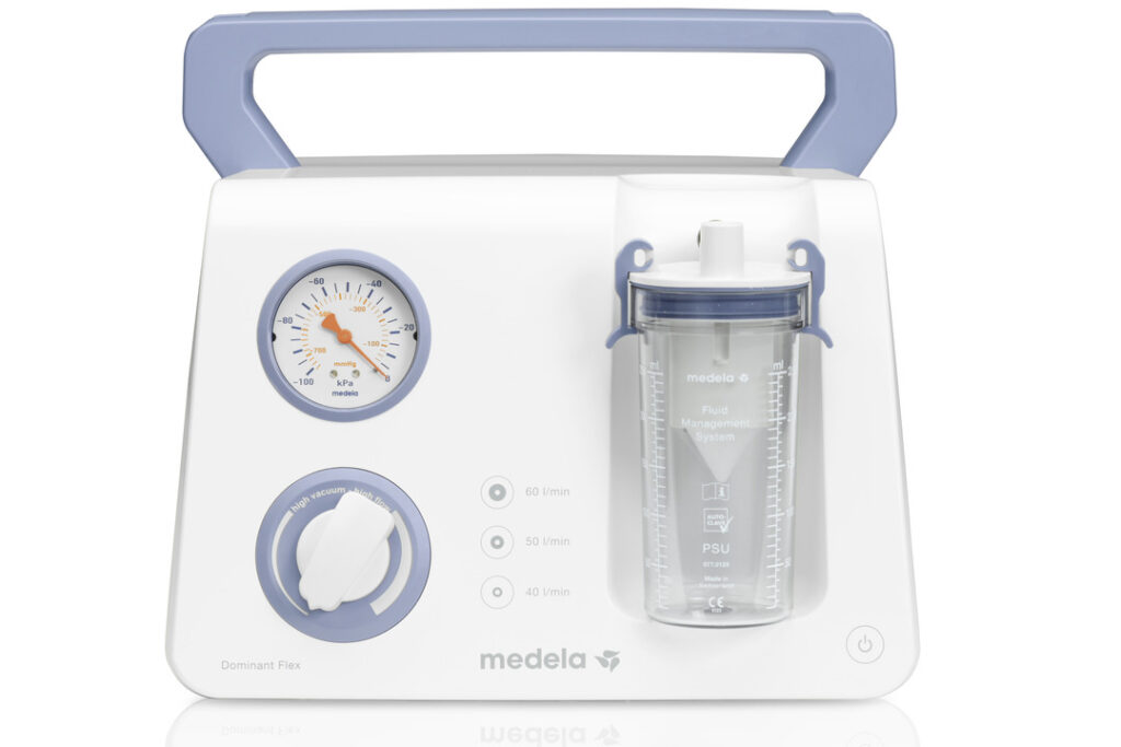 O Dominant Flex é um aspirador cirúrgico de alto vácuo (máximo de -95 Kpa ou -713 mmHg) é a opção mais avançada, da marca Medela. Possui botão de ajuste de vácuo, que pode fazer a sucção ir até 60 L/min, ou diminuir até 40 L/min com baixa velocidade de rotação e menos ruído. Seus demais atributos são: